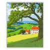 Vidék Nyugalma - számfestő készlet – 40×50 cm (Keret nélkül) A festmény egy nagy tölgyfát ábrázol a lankás, zöld dombokkal tarkított vidéki tájon, ahol a háttérben piros tetős házakból álló kis falu látható. A fényes zöld színek és a kék égbolt friss és n