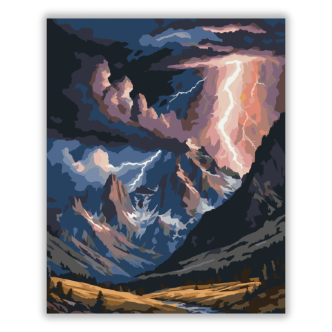 Viharos Égbolt Fensége - számfestő készlet – 40×50 cm (Keret nélkül) A kép a hegyek fölött tomboló vihar drámai pillanatát ábrázolja, lenyűgöző látványt nyújtva. A sötét felhők és a villámok kontrasztja erőteljes ecsetkezeléssel és merész színválasztással