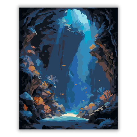 Világító Korallok Mélye - számfestő készlet – 40×50 cm (Keret nélkül) A festmény egy misztikus víz alatti barlangot ábrázol, ahol mélykék fény világítja meg a különös, világító korallokat és apró halakat. Az élénk kék, narancs és lila árnyalatok varázslat