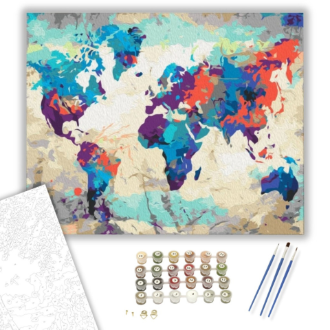 Világtérkép - számfestő készlet – 40×50 cm (Keretre feszítve) Készíts gyönyörű műalkotásokat, előzetes festő tudás nélkül! Éld át az alkotás gyönyörű pillanatait és varázslatos hangulatát! Akkor is gyönyörű festményeket hozhatsz létre, ha még nem festetté