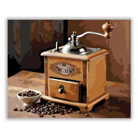 Vintage Kézi Kávédaráló - számfestő készlet – 40×50 cm (Keret nélkül) Ez a festmény egy vintage kézi kávédarálót ábrázol, melyből frissen őrölt kávé hullik egy fa deszkára, mellette egész kávészemek vannak elhelyezve. A meleg, földes színárnyalatok és a f