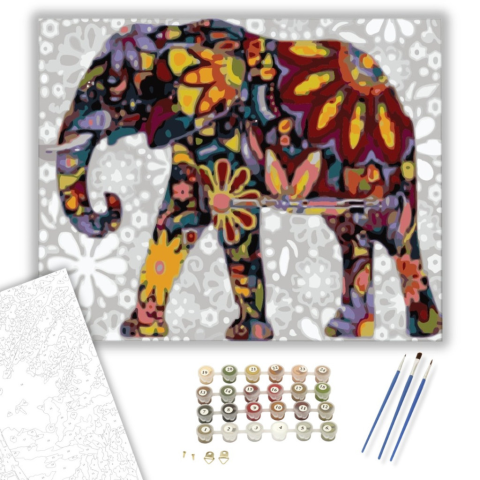 Virágból Készült Elefánt - számfestő készlet – 40×50 cm (Keretre feszítve) A festmény élénk színek kavalkádjával idézi meg a természet varázsát, ahol minden részlet egy újabb felfedezésre vár. Az elefánt alakja mesés történeteket sejtet, mintha egy titkos
