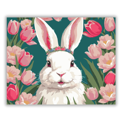 Virágkoszorús Nyuszi Tulipánok Között - számfestő készlet – 40×50 cm (Keret nélkül) A festmény egy bájos, fehér nyuszit ábrázol, akinek fejét színes virágkoszorú díszíti, körülötte rózsaszín tulipánok. A kép élénk színekben pompázik, a zöld és rózsaszín á