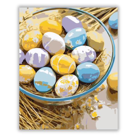 Virágos Húsvéti Tojások Üvegtálban - számfestő készlet – 40×50 cm (Keret nélkül) A festmény egy üvegtálba helyezett pasztell színű húsvéti tojásokat ábrázol, melyek szalmán pihennek. A tojások felületén tavaszi virágok tükröződnek, vidám színekkel díszítv