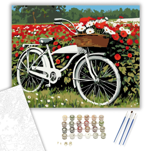 Virágos Kerékpármező - számfestő készlet – 40×50 cm (Keretre feszítve) A festmény egy régi kerékpárt ábrázol, amely egy vadvirágos mező szélén parkol, kosarában vörös gerberákkal és fehér margarétákkal. A kép élénk színekkel, piros és fehér virágokkal rag