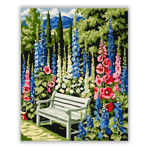 Virágos Kert Nyugalma - számfestő készlet – 40×50 cm (Keret nélkül) A festmény egy idilli kertet ábrázol, ahol a színes virágok és a fehér pad harmóniája elevenedik meg. Az élénk kék, piros és fehér virágok kontrasztja lendületes ecsetvonásokkal van megje