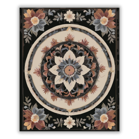 Virágos Mandala Bonyolult Mintázattal - számfestő készlet – 40×50 cm (Keret nélkül) A festmény egy részletes, virágos mandalát ábrázol, amelyben szimmetrikus, koncentrikus minták és levélmotívumok jelennek meg. A fekete, krémszínű, kék és vörös árnyalatok