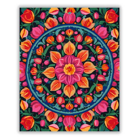 Virágos Mandala Rózsákkal és Tulipánokkal - számfestő készlet – 40×50 cm (Keret nélkül) A festmény egy részletgazdag mandalát ábrázol, amely rózsákkal és tulipánokkal van díszítve. Az élénk rózsaszín, narancs és zöld színek élénk és harmonikus összhatást