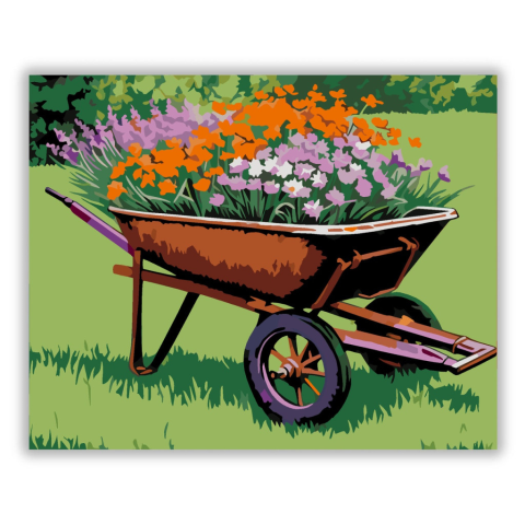 Virágos Taliga Harmóniája - számfestő készlet – 40×50 cm (Keret nélkül) A festmény egy régi taligát ábrázol, mely tele van élénk színű virágokkal, megidézve a Van Gogh-féle természetérzékelést. Az intenzív narancs és rózsaszín virágok kontrasztja a zöld h