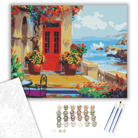 Virágos Terasz - számfestő készlet – 40×50 cm (Keretre feszítve) Ez a festmény egy nyugodt, mediterrán terasz hangulatát idézi, ahol a tenger morajlása lágy dallamként kíséri a látogatót. A kép mesél a napfényes délutánokról, ahol az élet apró örömei bont