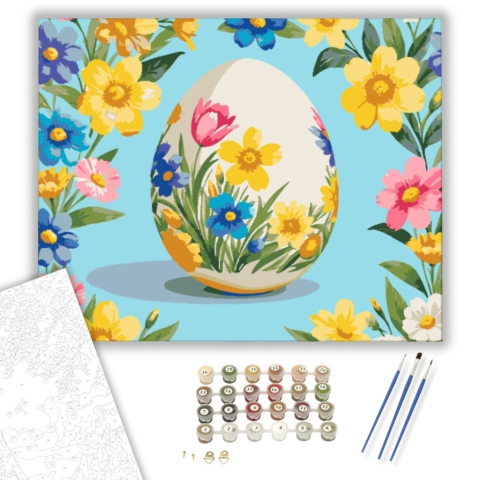 Virágos Tojás - húsvéti számfestő készlet – 40×50 cm (Keretre feszítve) Készíts gyönyörű műalkotásokat, előzetes festő tudás nélkül! Éld át az alkotás gyönyörű pillanatait és varázslatos hangulatát! Akkor is gyönyörű festményeket hozhatsz létre, ha még ne