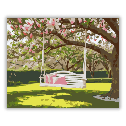 Virágzó Magnólia Hinta - számfestő készlet – 40×50 cm (Keret nélkül) A festmény egy virágzó magnóliafát ábrázol, amelynek ágaiból egy bájos fa hinta lóg. A rózsaszín szirmok lágy, romantikus hangulatot teremtenek a zöld pázsit felett. A kép a tavaszi term