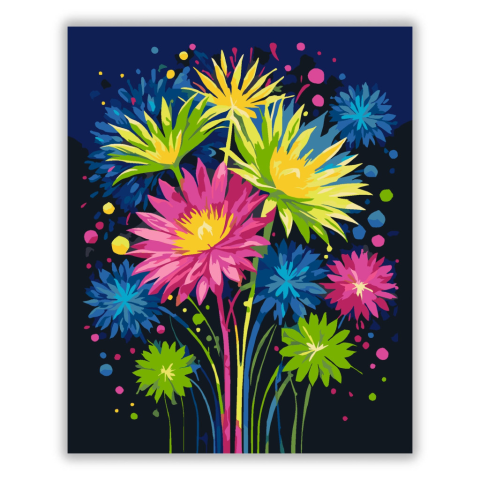 Virágzó Színrobbanás - számfestő készlet – 40×50 cm (Keret nélkül) A kép dinamikus virágos absztrakciót ábrázol, amely tűzijátékszerűen robban szét. A színek élénkek, forró pink, lime zöld, elektromos kék és aranyló sárga árnyalatokkal, sötét háttér előtt