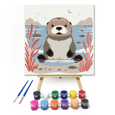 Vízben ülve - gyerek számfestő készlet – 20×20 cm (Keretre feszítve) Ez a kép egy aranyos kis vidrát ábrázol, aki boldogan üldögél a vízben, körülötte tavi növényekkel. A barátságos kék és piros árnyalatok vidám hangulatot teremtenek. Ideális választás gy