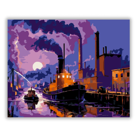 Vontatóhajó és Bárka Ipari Csatornában - számfestő készlet – 40×50 cm (Keret nélkül) A festmény egy vontatóhajót ábrázol, amely egy ipari csatornában halad alkonyatkor. A háttérben gyárkémények emelkednek, füstöt eregetve az ibolyaszín ég felé. A kép ipar
