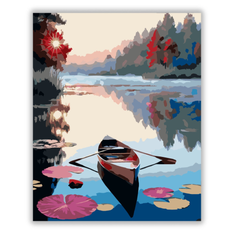 Vörös Evezős Csónak Tavirózsák Között - számfestő készlet – 40×50 cm (Keret nélkül) A festmény egy kis vörös evezős csónakot ábrázol, amely tavirózsák között sodródik egy nyugodt tavon, napfelkeltekor. A meleg narancs és vörös színek, valamint a hajnali k