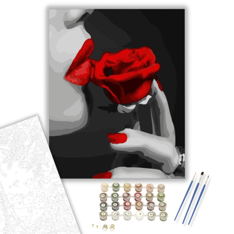 Vörös Rózsa - számfestő készlet – 40×50 cm (Keretre feszítve) Ez a festmény érzéki és titokzatos hangulatot áraszt, magával ragadva a nézőt egy rejtélyes világba. A kompozícióban megbújik egy történet, amely a szenvedély és vágy finom határán játszódik. A
