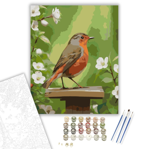 Vörösbegy a Madárodúnál - számfestő készlet – 40×50 cm (Keretre feszítve) A festmény egy vidám vörösbegyet ábrázol, amint egy fából készült madárodún ül, körülötte tavaszi virágokkal. A madár élénk vörös mellkasa kontrasztot alkot a lágy zöld háttérrel, a