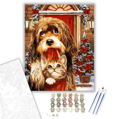Zsákba macska - számfestő készlet – 40×50 cm (Keretre feszítve) A kép melegséget és meghittséget sugároz, mintha a tél varázsa egy pillanatra megállt volna. Egy kutya és egy cica bájos pillanata, ami mesébe illő történetet sejtet. A piros és zöld színek k
