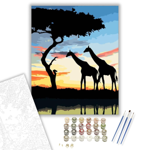 Zsiráfok - számfestő készlet – 40×50 cm (Keretre feszítve) A festmény egy nyugodt naplementét ábrázol, amely békés csendet áraszt. A képen két zsiráf sziluettje bontakozik ki, mintha egy titokzatos történetet mesélnének el a szavanna életéről. A háttérben