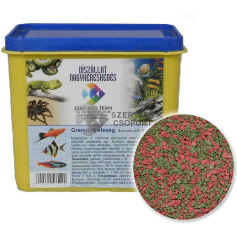 Szer-Ber granulált szemcsés eleség akváriumi díszhalak etetéséhez. Ideálisan alkalmazkodik a halak táplálkozási szükségleteihez. A könnyen emészthető, jól hasznosuló fehérjék (halhús, garnélaliszt, búzacsíra) fontos rostokat és ásványi anyagokat is tartalmaz.