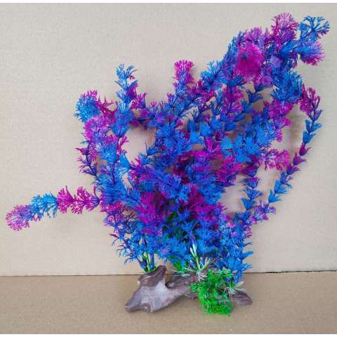 Nagyméretű lila és kék ambuliatelep akváriumi műnövény. Mutatós, természetes hatású dísz. A dekorációs szerepe mellett a díszhalaknak is rejtekhelyet nyújt, ami nagyban növeli a komfortérzetüket. Élő növényekkel együtt is behelyezhető, remekül kiegészíti a látványvilágot. Talpa nehezékként szolgál, stabilan az akvárium alján tartja a műnövényt.
