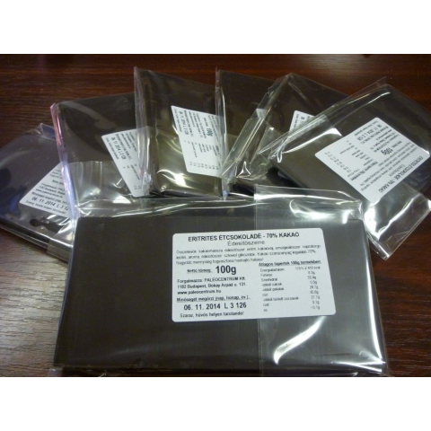 Eritrittel édesített csokoládé 70% kakaótartalommal.Egészséges és finom nassolnivaló. Összetevők: kakaómassza, édesítőszer: eritrit (29%), kakaóvaj, emulgeálószer: napraforgó lecitin, aroma, édesítőszer: szteviol glikozidok (0,02%). Kakaó szárazanyag l