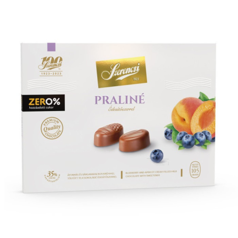 Szerencsi zero praliné áfonya és sárgabarack töltött maltitos tejcsokoládé 105 g Összetevők: tejcsokoládé 55% (édesítőszer: maltitok, kakaóvaj, zsíros tejpor, kakaómassza, emulgeálószer: lecitinek (szója), vanília aroma), áfonyás krém 22,5% [édesítősze
