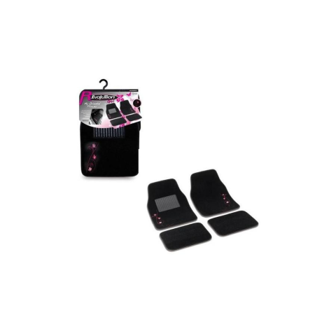 Fekete alapon, a két első szőnyegen rózsaszín virágmintával.Mosógépben mosható, porszívózható, puhább kefével kefézhető.