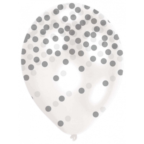 Silver konfettis léggömb, lufi 6 db-os 11 inch (27,5cm) Anyaga: latex/gumi Mérete: 27,5 cm A lufi tartó pálca + csésze külön megvásárolható áruházunkban (KFJ_DPA9911929 vagy KFJ_DPA9917359).