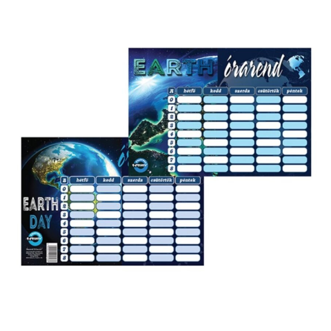 Nagyméretű órarend galaxy föld mintával, fiúknak. Kétoldalas - A és B hetes, 0-8 óráig. Kétoldalas, a képen látható két mintával. Mérete: 23,5x16,5 cm.