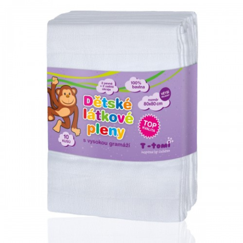 A T-tomi minőségi, fehér textilpelenka tökéletes választás, hiszen magas minőségű pamutból készült. Üreges szövési technológiával készült, ezért nedvszívó képessége kiemelkedő. Rendkívül puha anyagának köszönhetően kíméletes az érzékeny bababőrhöz, így egyes eldobható pelenkákkal ellentétben csökkenti az allergiás reakció kialakulásának lehetőségét. Kiválóan alkalmas büfiztetéshez, szoptatáshoz, alváshoz a gyermek feje alá (babakocsiba