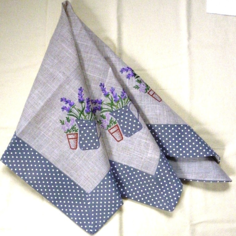 Lenes, hímzett levendula mintás díszterítő, asztalközép, napron, pöttyös szegéllyel. 85 cm x 85 cm. Lenes, hímzett levendula mintás díszterítő, asztalközép, futó, pöttyös szegéllyel. Méret: 85 cm x 85 cm. Szín: szürke - pöttyös szegély és minta. Összet