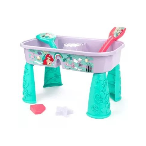 Disney hercegnők: Ariel homokozó asztalka kiegészítőkkel. A dobozban egy stabil, Ariellel díszített, 2 részre osztott homokozó asztalka, egy gereblye, egy lapát valamint 2 homokozóforma található. Csomagolás mérete: 28,5 x 41,5 x 10 cm