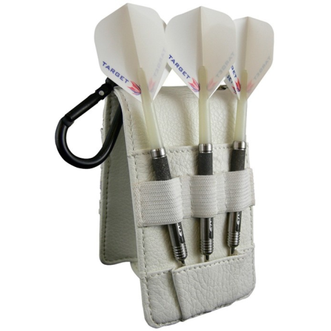 A Target Match Play White műbőr darts tok egy magas minőségű, stílusos tok, mely használatával könnyedén szállíthatjuk és óvhatjuk darts nyilainkat. A tokban elfér 3 komplett darts, illetve minden plusz kiegészítő, tollak, szárak, hordók. A tokon található egy karabiner is, mely segítségével könnyedén felcsatolhatjuk ahova szeretnénk.