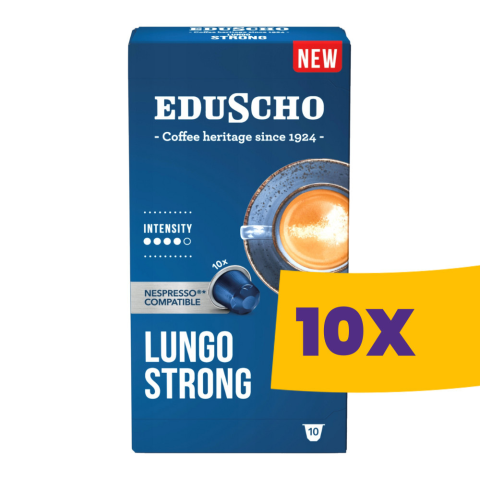 Aromás, telt ízű lungo, közepes pörköléssel. Az Eduscho Lungo Strong kapszula közepes pörkölésű kávéból készül, amely aromás és telt ízvilágot kínál. Hosszabb kávéélményhez ideális, gazdag aromával és kiegyensúlyozott karakterrel. Nespresso gépekkel ko