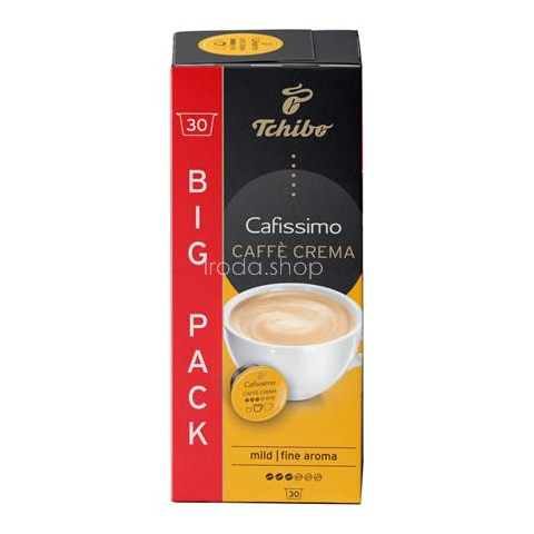 Kávékapszula, 30 db, TCHIBO Cafissimo Caffé Crema Fine A Caffe Crema Fine továbbfejlesztett receptúrájának köszönhetően most még lágyabb. Engedje, hogy elcsábítsa ez a bársonyos íz. Enyhén gyümölcsre emlékeztető, könnyű állagú kávé, mely a Tchibo kímél