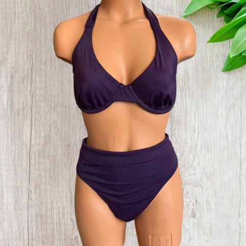 Sötét lila bikini Felső része Merevítős, nyakpántja kötős, háta kapcsos. Méret:85C Alsó része Derekán díszpánttal , rugalmas sztreccs anyag. Méret:44-es Hibátlan állapotú.