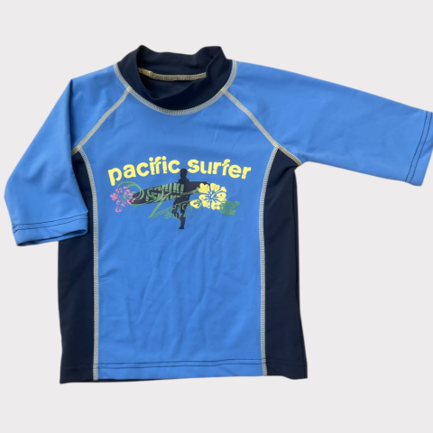 Szörfös fürdő felső Egyenes szabású, kissé magasított nyakú. Rugalmas, sztreccs anyag, elején szörfös mintával. Hibátlan állapotú.