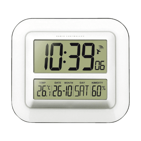 Dcf-77 Rádióvezérlésű óra Kézi időbeállítási lehetőséggel 12/24 órás időkijelzés Időzóna beállítás (± 12h) Dátum és hét nap kijelzés (7 nyelven) Beltéri hőmérséklet kijelzés Beltéri páratartalom kijelző Riasztó szundi funkcióval Falra vagy asztalra rögzíthető