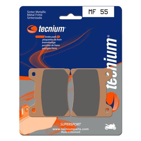 A TECNIUM kifejlesztett egy teljes körű, teljesítményes betéteket és cipőket kínáló termékpalettát minden disciplínához.Sinterelt betétek. Kiváló egyensúlyt nyújtanak az hatékonyság és a tartósság terén a sportteljesítményhez. Az előlap betétek MF (magas súrlódású) a hátsó betétekkel MR (közepes súrlódású) kombinálva kiváló egyensúlyt biztosítanak a fékezés terén. Dánia gyártotta.