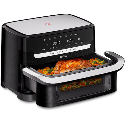 Airfryer - digitális vezérlés, 35 - 200 °C között szabályozható hőmérséklet, tapadásmentes felület, kijelző, mosogatógépben mosható részek, hőmérséklet szabályozás és automatikus programok, 7 program, kivehető edény, 2700 W teljesítmény, 9 l-es edény tapadásmentes felülettel, 2 fritőz kosár, kábel hossza 0,9 m, tömege 7,67 kg, méretei 30,7 × 47,4 × 36,4 cm (ma × szé × mé), fekete kivitel Tefal EY9228E0 Dual Easy Fry Flex forrólevegős sütőÉlvezd a go
