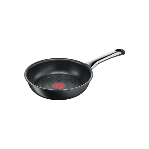 Serpenyő - kerek, az edény teste alumíniumból készült, használható elektromos, gáz, üvegkerámia és indukciós főzőlapon, hőindikátor, nem éles fémeszköz használatának lehetősége, alkalmas sütőbe, mosogatógépben mosható és tapadásmentes felület, Titánium külső felület, ergonomikus, alumínium fogantyú, megerősített fenék, maximális sütési hőmérséklet a sütőben 175 °C, magassága 5,65 cm, serpenyő felső szélének átmérője 22 cm, serpenyő aljá