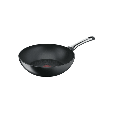 Wok serpenyő - alumínium, kerek, használható elektromos, gáz, kerámia és indukciós főzőlapon, hőindikátor, nem éles fémeszköz használatának lehetősége, alkalmas sütőbe, mosogatógépben mosható és tapadásmentes felület, alumínium külső felület, ergonomikus, alumínium fogantyú, erős fenekű, maximális sütési hőmérséklet a sütőben 175 °C, magassága 7,75 cm, serpenyő felső szélének átmérője 28 cm, a serpenyő aljának külső átmérője 17,4 cm, fek
