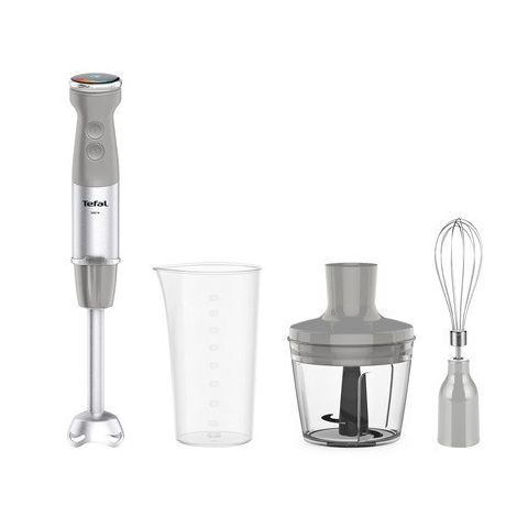 Botmixer - teljesítmény 1 000 W, Powelix 4 éles pengetechnológia, kompakt aprító (aprítás, habverés, turmixolás), 20 változtatható sebesség és turbó üzemmód, csendes üzemmód, puha és ergonomikus markolat, ellenálló fémtest, fröccsenés elleni védelem, könnyű karbantartás, levehető alkatrészek mosogatógépben tisztíthatók, levehető tartozékok, mellékelt 800 ml mérőedény, 500 ml aprító, habverő, keverőszár, szín szürke/ csiszolt rozsdamentes, 15 év ja
