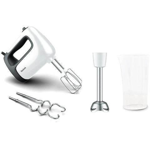 Kézi mixer 500 W teljesítményfelvétellel, sebességek száma 5, turbó impulzus funkció, habverők, dagasztóhorgok és rozsdamentes acél keverőelem mérőedény, ergonómikus felülettel ellátott fogantyú, stabil raktárhelyiség, kivehető alkatrészek mosogatógépben moshatók, fehér és sötétszürke, 15 év javíthatósági garancia SELECT BRAND: BevezetésFontos információkGalériaTechnikai specifikációkTefal HT462138 Prep Mix + kézi mixerA kézi keverő minden konyhában