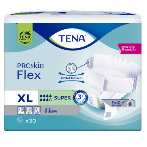 A TENA Flex Super egy inkontinencia esetére készült rugalmas, öves pelenkanadrág, amelynek célja, hogy megkönnyítse és ergonomikusabbá tegye a termék cseréjét. Teljesen és korlátozottan mozgásképes, valamint mozgásképtelen személyek is használhatják. A