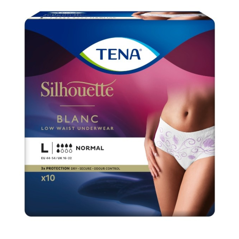 Tena Lady Pants Discreet Silhouette pelenkanadrág Tena Lady Pants Silhouette női pelenka L - 10db Eldobható, egyszerhasználatos, diszkrént női Tena Blanc női pelenkanadrág, L-es 44-54 méretben, 95-125 cm-es derékbőségre, 10 db-os csomagban vásárolható.