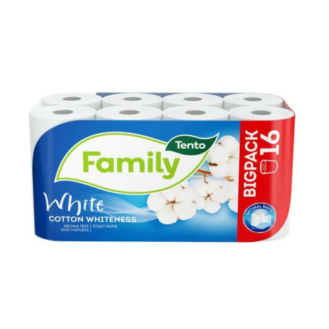 A Toalettpapír, 2 rétegű, kistekercses, 16 tekercs, TENTO Family White, fehér (KHH755) A Tento Family White fehér toalettpapír (wc papír) tiszta és természetes fehérségének puha érintésének megbízhatósága és finomsága mindenkit meggyőz. - 150 lapos - 16