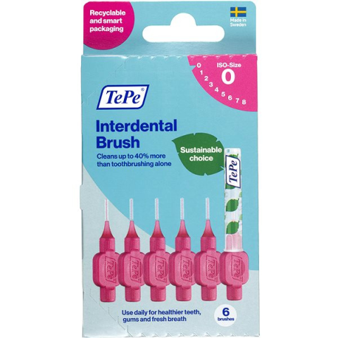 Fogköztisztító kefe - kompakt, ISO méret 0 (0 - 0,6 mm), alkalmas 0,6 - 2,2 mm méretű fogközökhöz, drót átmérője 0,4 mm, sörték átmérője 0,7 mm, hagyományos szálak, rózsaszín kivitel, 6 darabos csomag A TEPE MK Original 0,4 mm-es fogköztisztító kefék hatékony tisztítást biztosítanak a fogközökben, ahová a hagyományos fogkefe nem ér el. A klasszikus sörtéknek és a műanyag bevonatú fémdrótnak köszönh